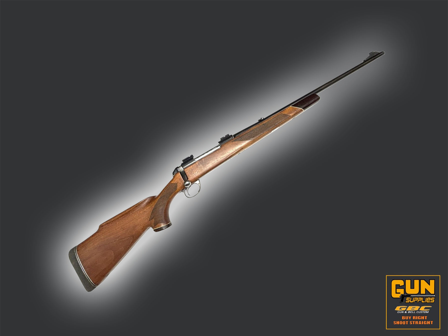 The rifle features a polished blued steel barrel action and floorplate trigger guard.
